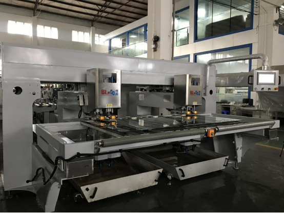 This is an automated processing workshop for automotive glass. The equipment is equipped with a glass placement platform, and a device for collecting water or glass residues is installed below. On the right side, there is also a robotic arm – type loading device with multiple suction cups for automatic glass loading, and it is also matched with a universal wheel pre – positioning device. The overall layout is in an automated production line, reflecting the automated production scenario of glass drilling and processing, which is suitable for precision drilling processes of furniture glass, automotive glass, etc.We can customize glass processing solutions according to customer requirements